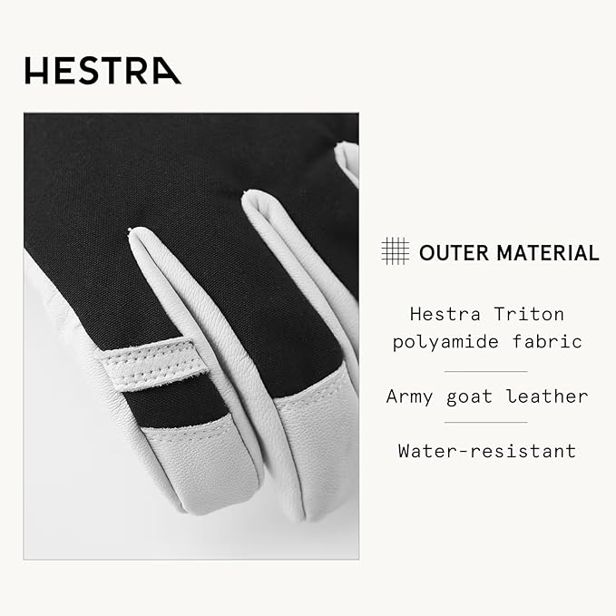 The Hestra Heli Glove has an outer layer comprised of Triton/Polyamide material. Hestra's proprietary fabric is windproof, waterproof, and breathable to create a very comfortable glove. This glove is insulated with Quallofill/Fiberfill and has a removable lining made from Bemberg/Polyester fabrics. Lastly, Hestra has added extra durability in the palm by using proofed Army Leather.