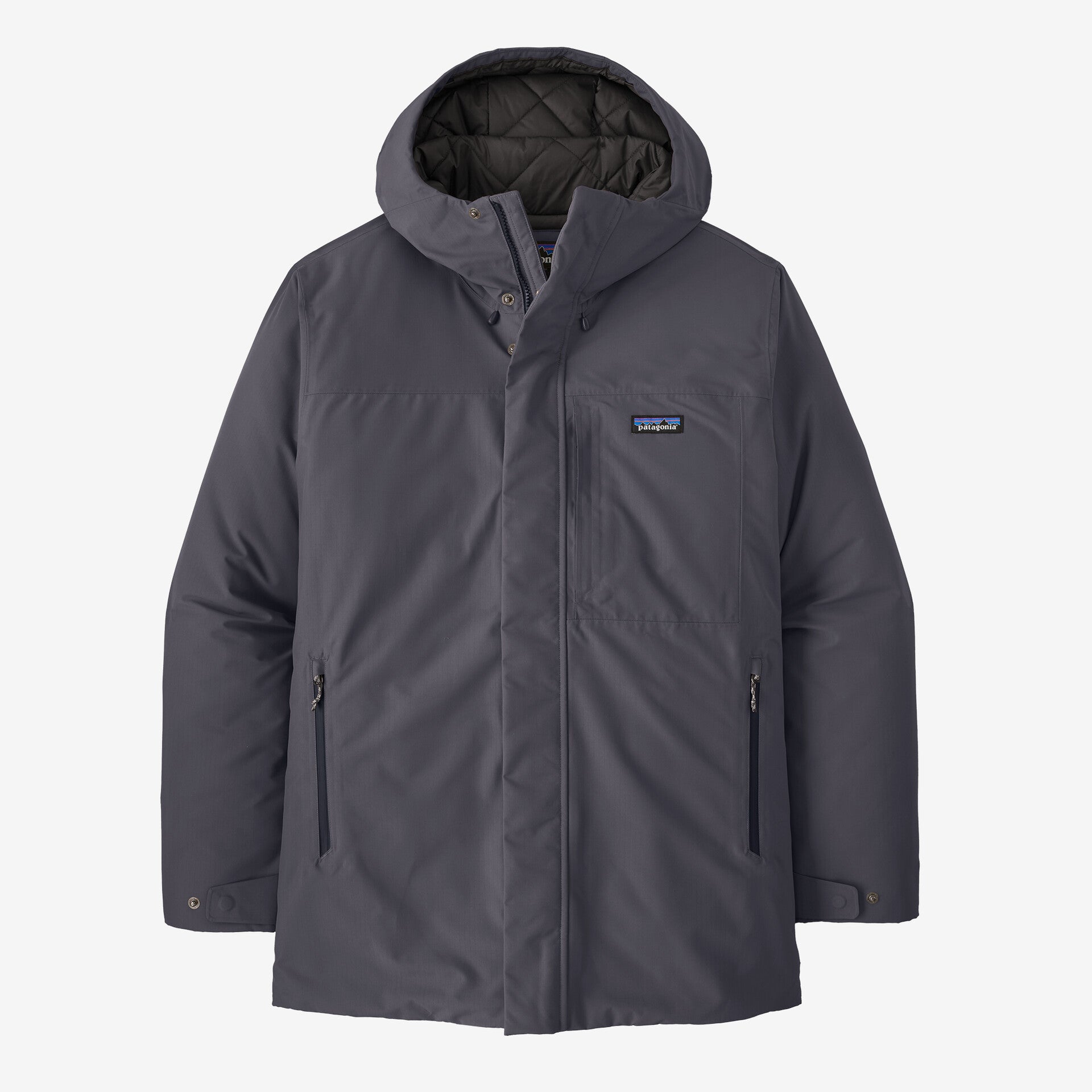 Spacious hood cinches down with a drawcord; center-front zipper closure and a snap-closure storm flap keep out the cold