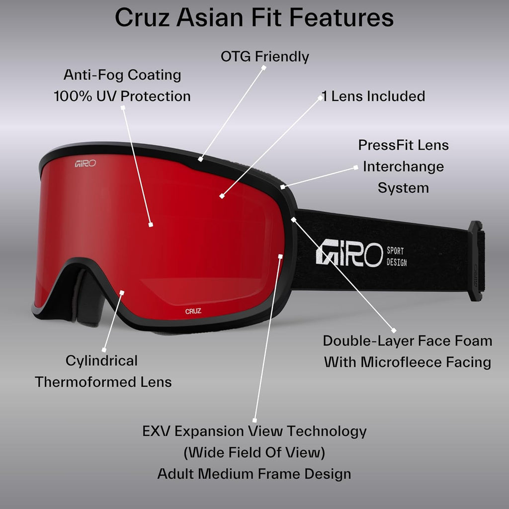 This stylish, medium fit frame packs many of the features of goggles that cost three-times more, including Expansion View Technology for a wide field of view, anti-fog lens coating and Seamless Compatibility with all Giro helmets. Plus, the silicone on the inside of the Cruz's goggle strap prevents slippage and ensures that it stays in place over your helmet or on beanie.